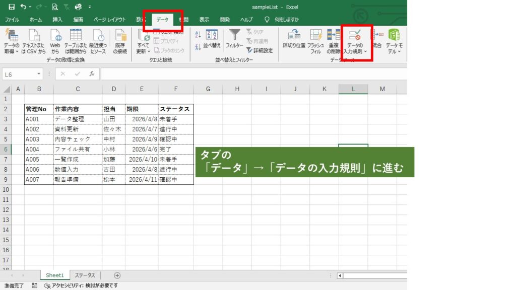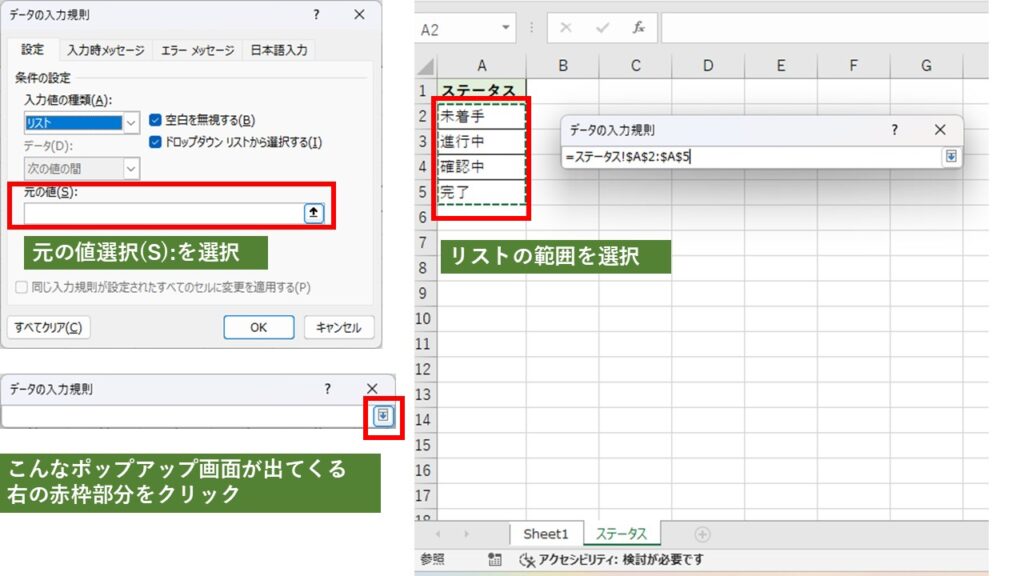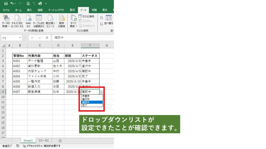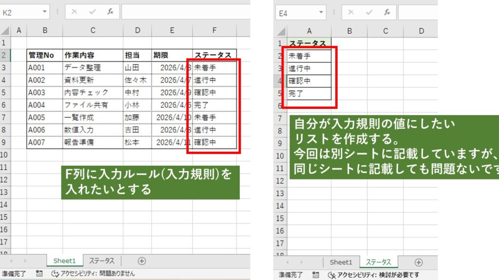 入力したい内容(例:未着手・進行中・確認中・完了)を、別シートまたは同じシートに一覧で作成します。