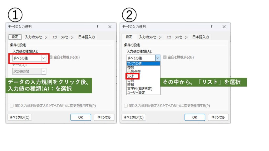 ■ Excelのプルダウン(入力規則)の設定方法①