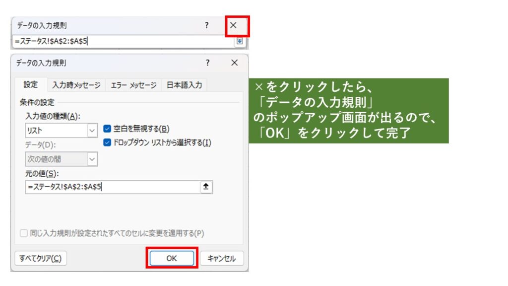 「元の値」に、先ほど作成したリスト範囲を指定して「OK」をクリックします。