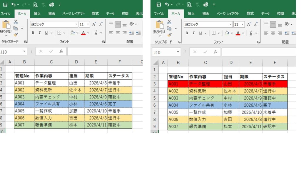 プルダウンで入力を統一したら、次は「条件付き書式」で視覚化します。