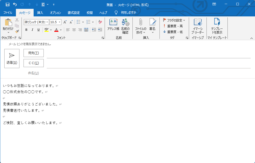 まず、Outlookで「新しいメール」を作成します。通常のメール作成画面を開いてください。