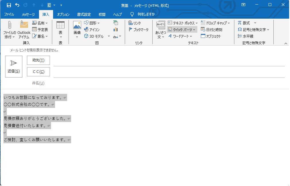 メール本文に、定型句として保存したい文章を入力します。挨拶文、締めの文章、よく使う依頼文など、何でも構いません。