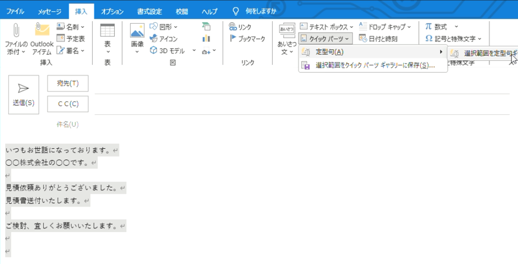 画面上部のリボンメニューから「挿入」タブをクリックし、「クイックパーツ」→「定型句」→「選択範囲を定型句ギャラリーに保存」を順番に選択します。