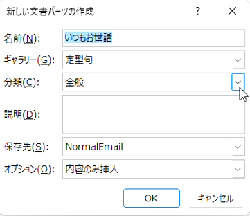 「新しい文書パーツの作成」というポップアップウィンドウが表示されます。ここで分かりやすい名前(例:「見積返信」「お礼メール」など)を記載してOKを押せば完了です。